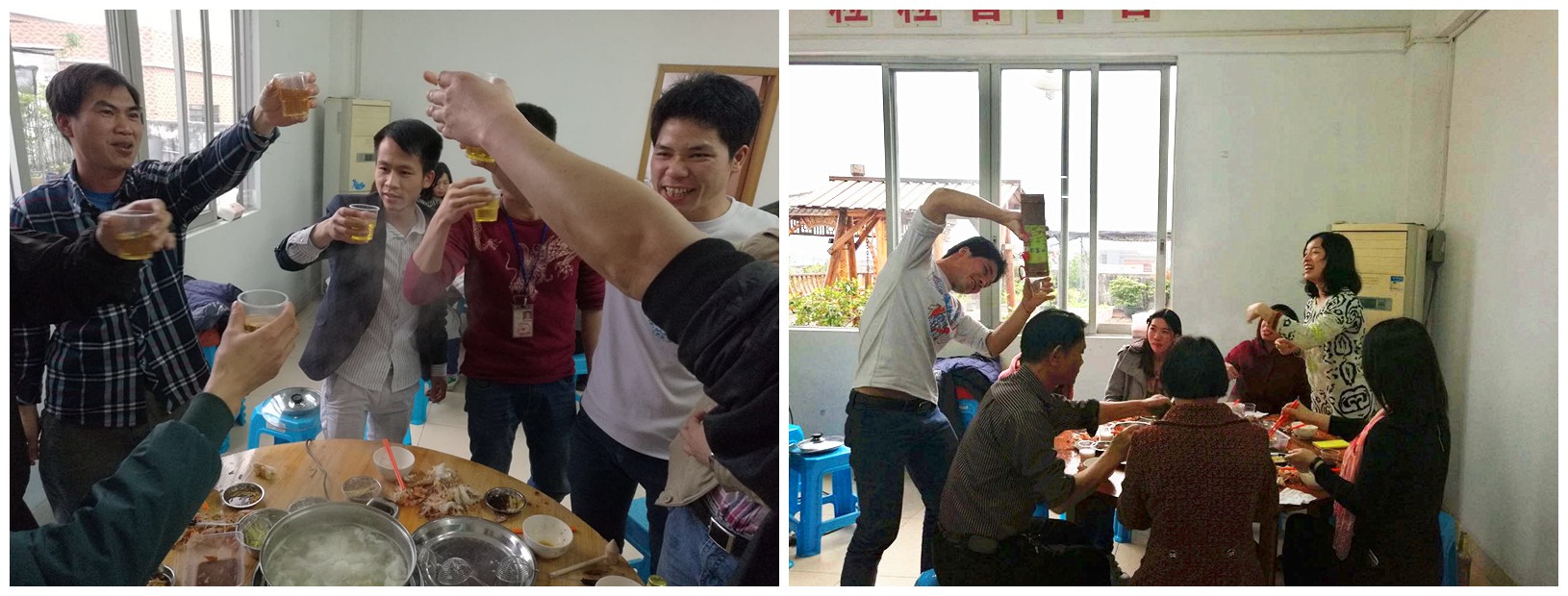 經(jīng)過同事們的齊心協(xié)力和廚房大叔阿姨的辛勤準(zhǔn)備下,在這春意融融的晚上,大伙們吃著、喝著、鬧著、笑著,真好!